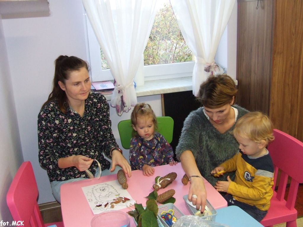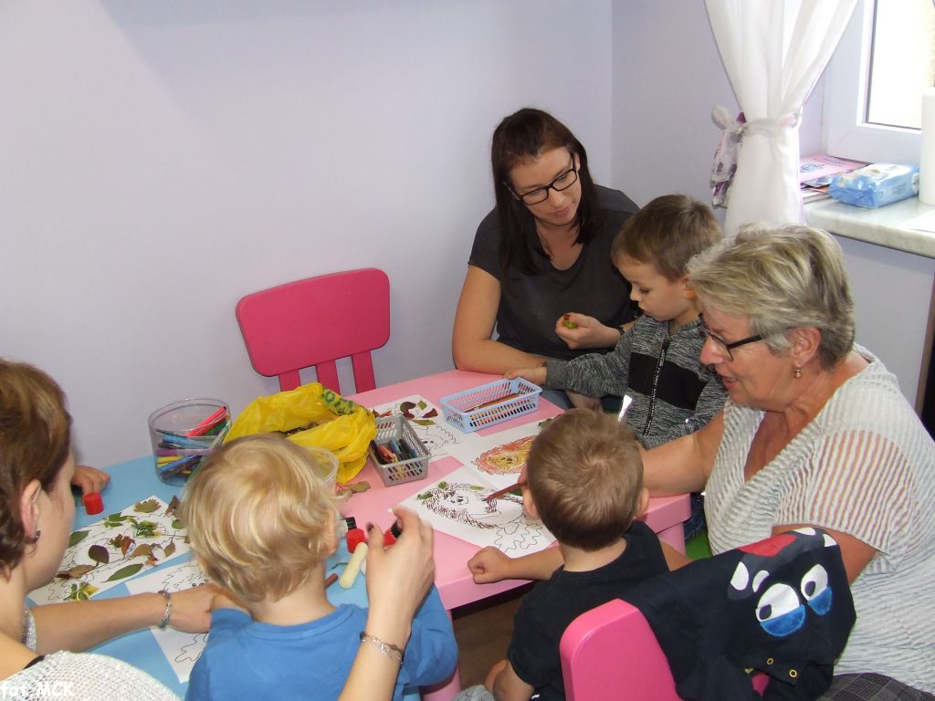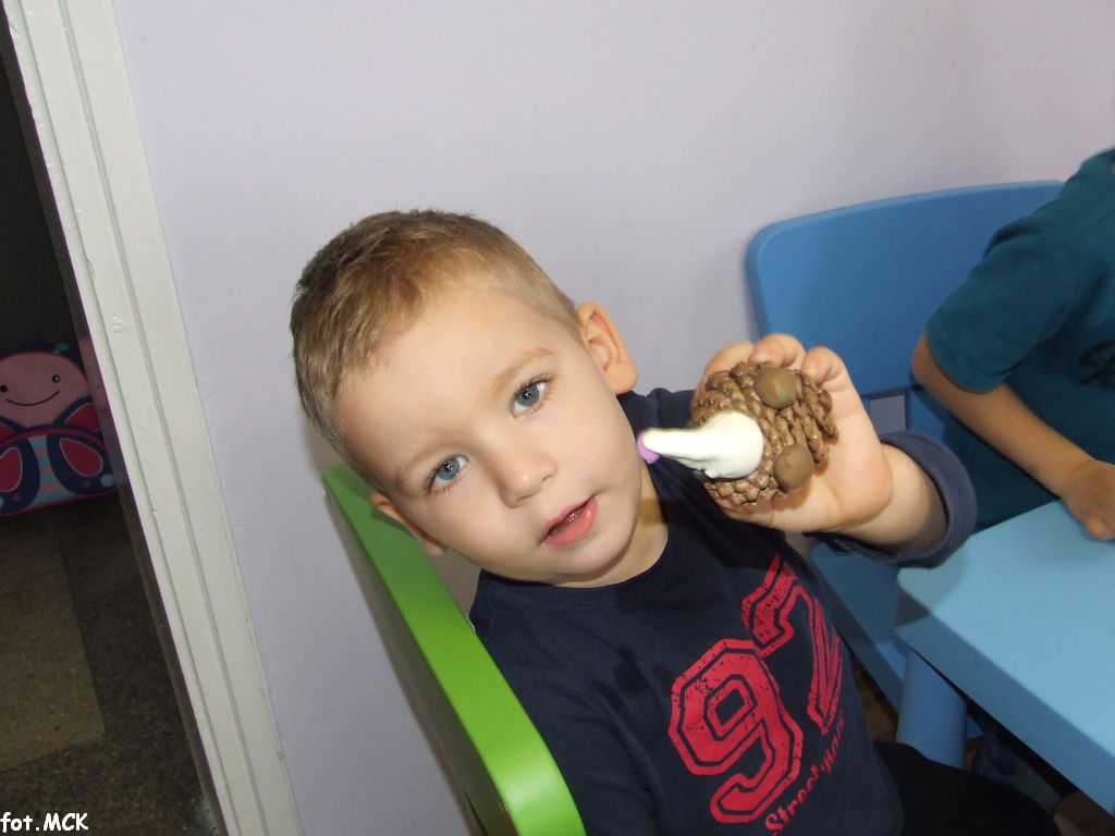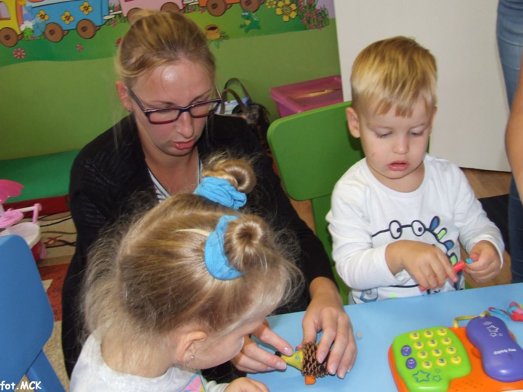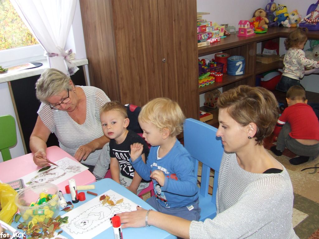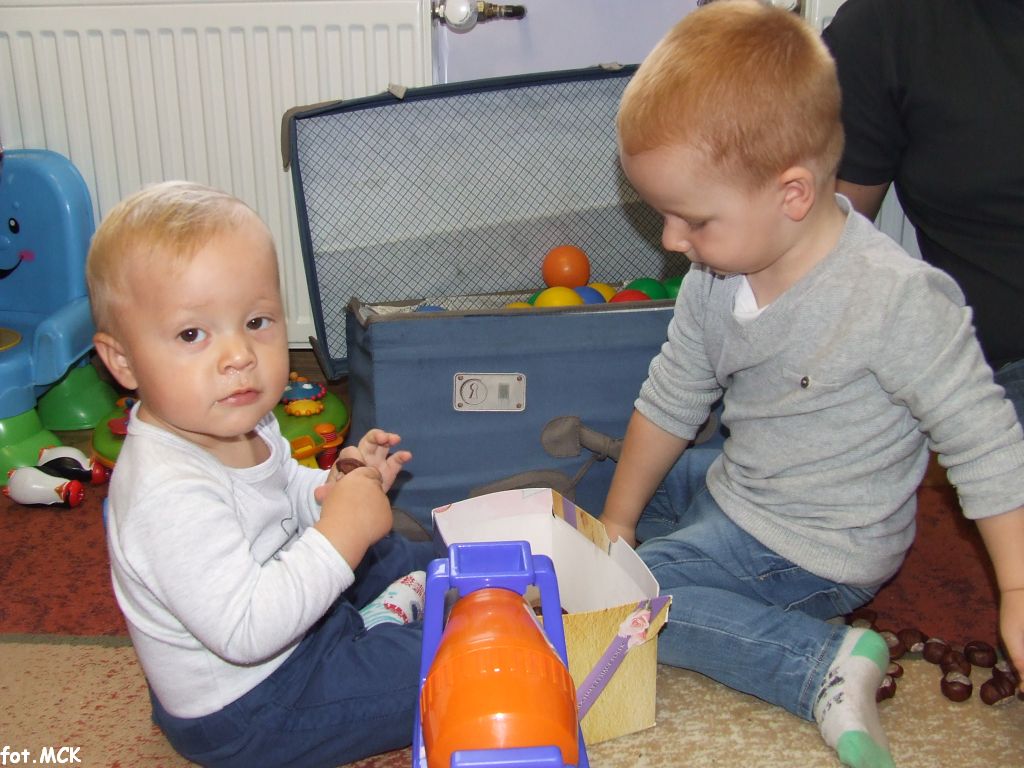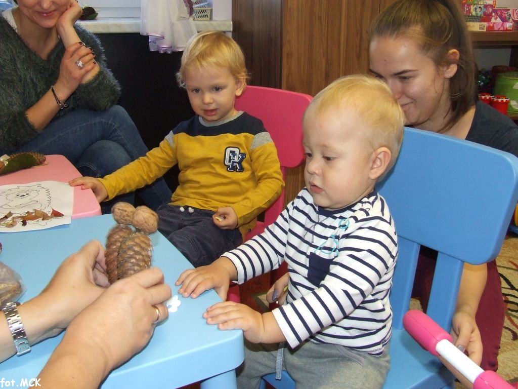 Zajęcia Grupy Zabawowej w październiku upłynęły nam w jesiennej atmosferze. Zabawa dzieci urozmaicona była zajęciami plastycznymi, których tematem przewodnim były „skarby jesieni”. Zrobiliśmy zwierzątka z kasztanów, jeżyki z szyszek, ozdabialiśmy obrazki kolorowymi listkami.
