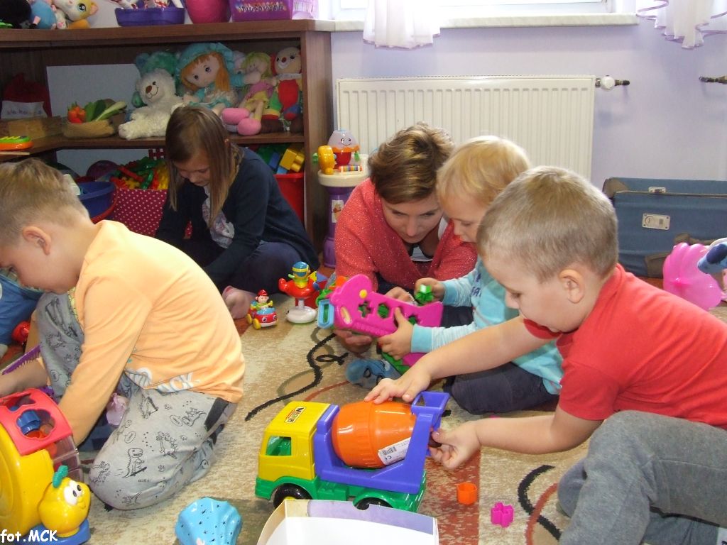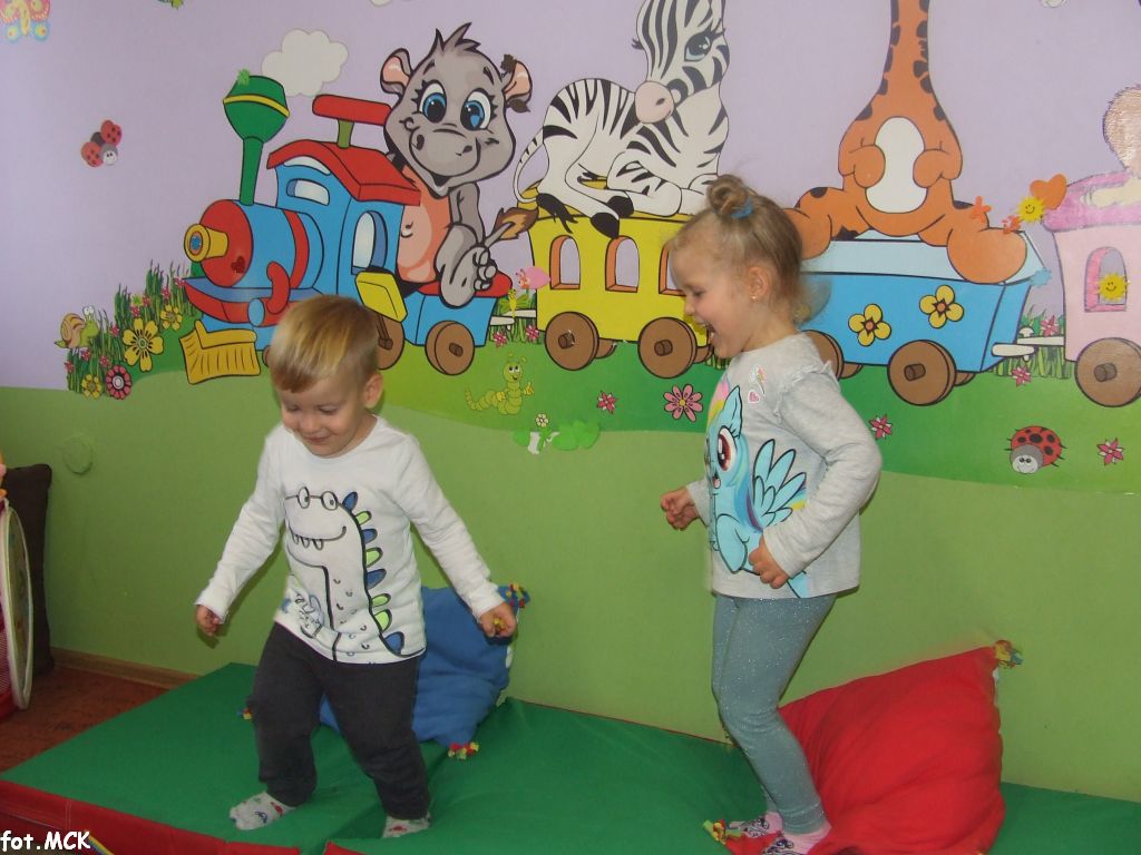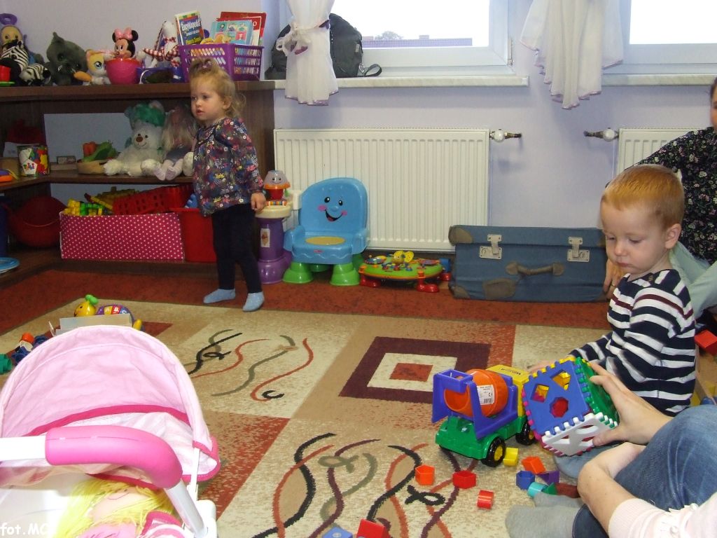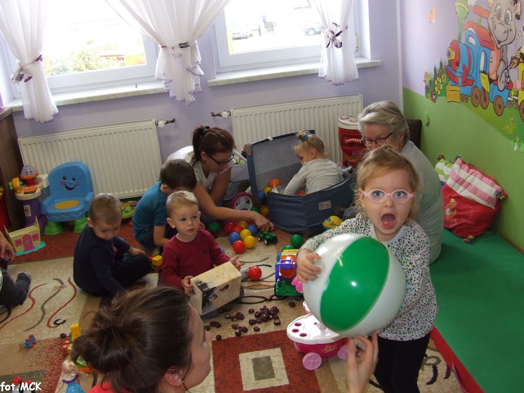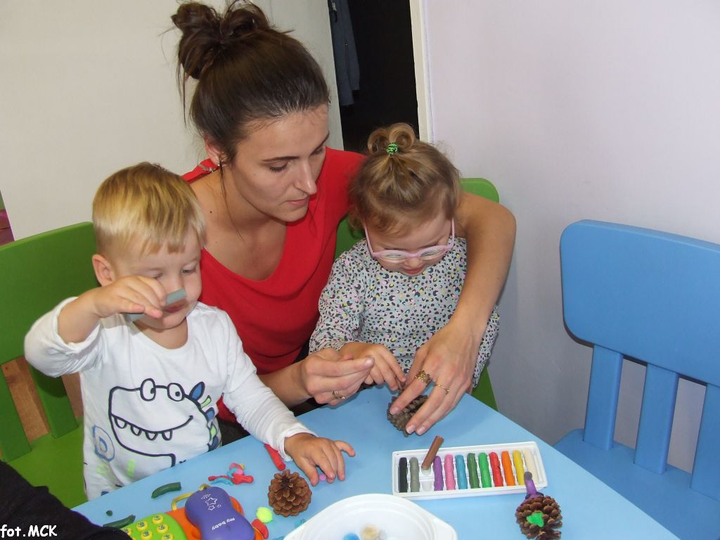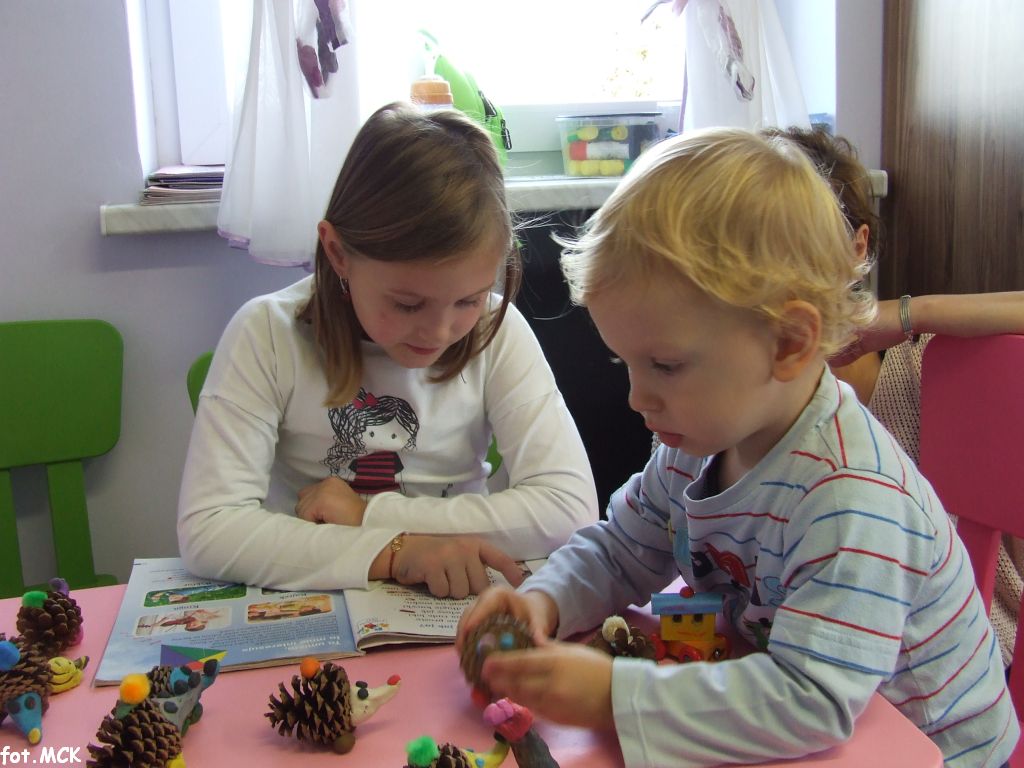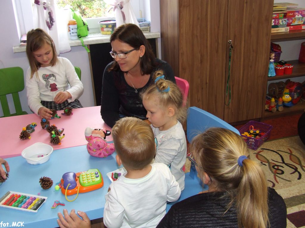 Zajęcia Grupy Zabawowej w październiku upłynęły nam w jesiennej atmosferze. Zabawa dzieci urozmaicona była zajęciami plastycznymi, których tematem przewodnim były „skarby jesieni”. Zrobiliśmy zwierzątka z kasztanów, jeżyki z szyszek, ozdabialiśmy obrazki kolorowymi listkami.