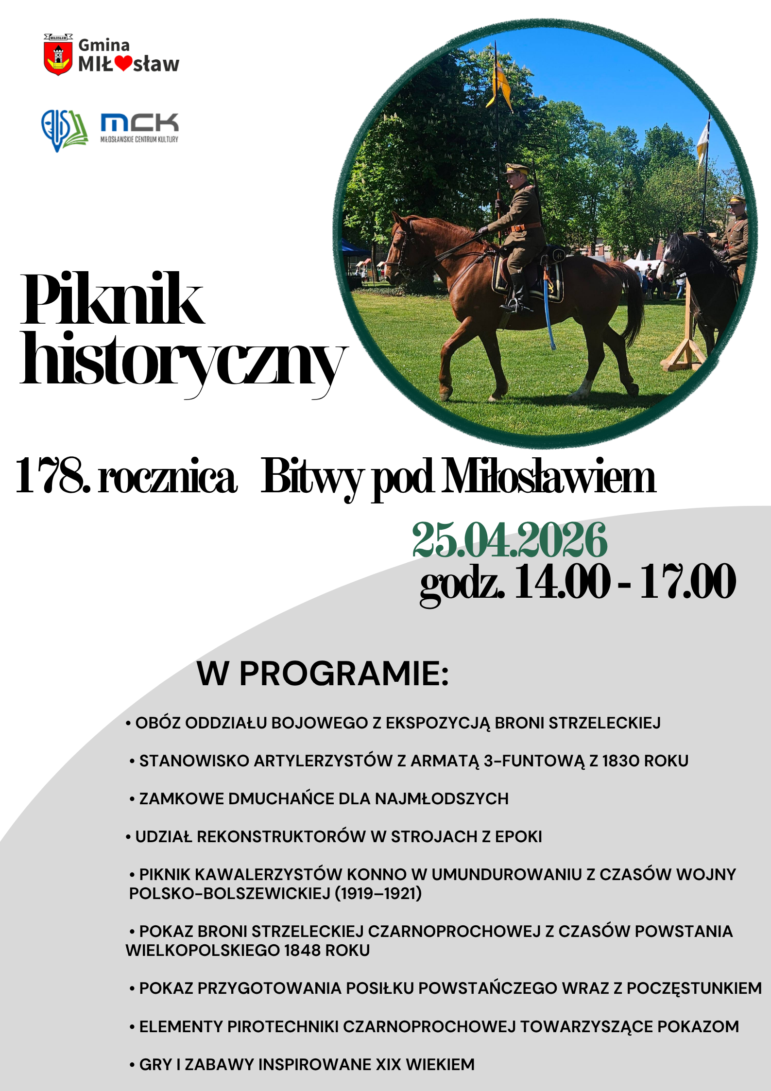 Piknik historyczny 2026 utworzone przez Agnieszka | kwi 15, 2026 | Aktualności, Wydarzenia | 0 komentarzy Zapraszamy na Piknik Historyczny 25.04.2026 r.