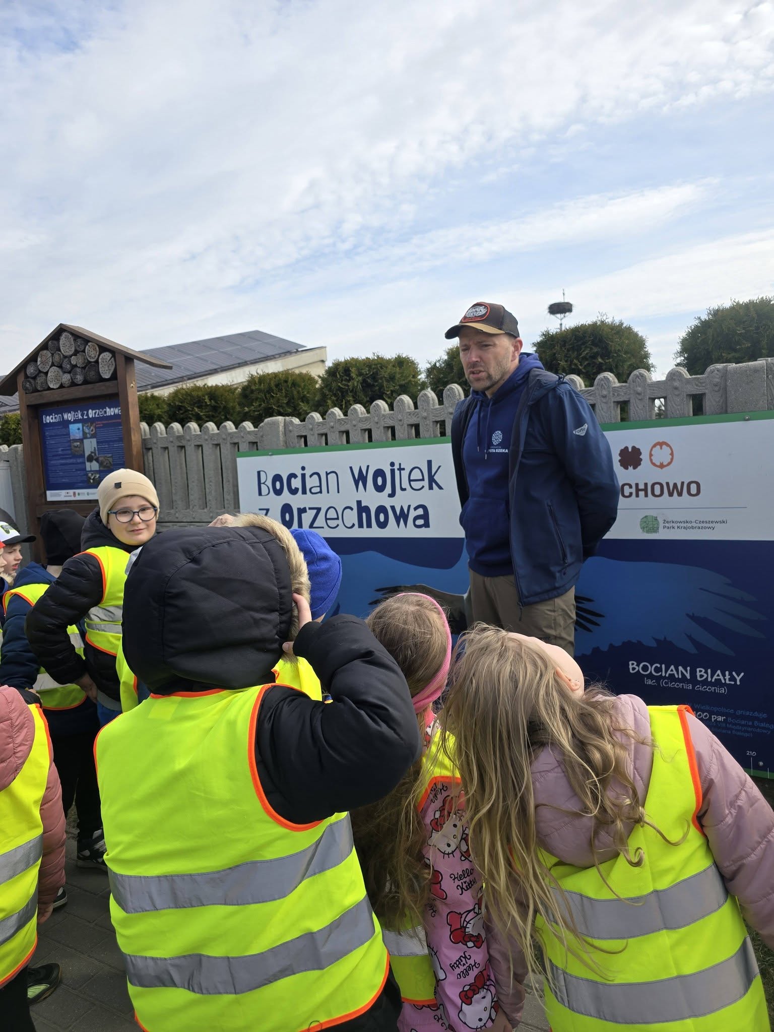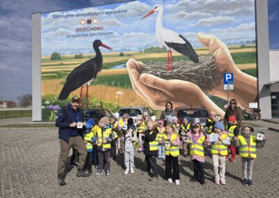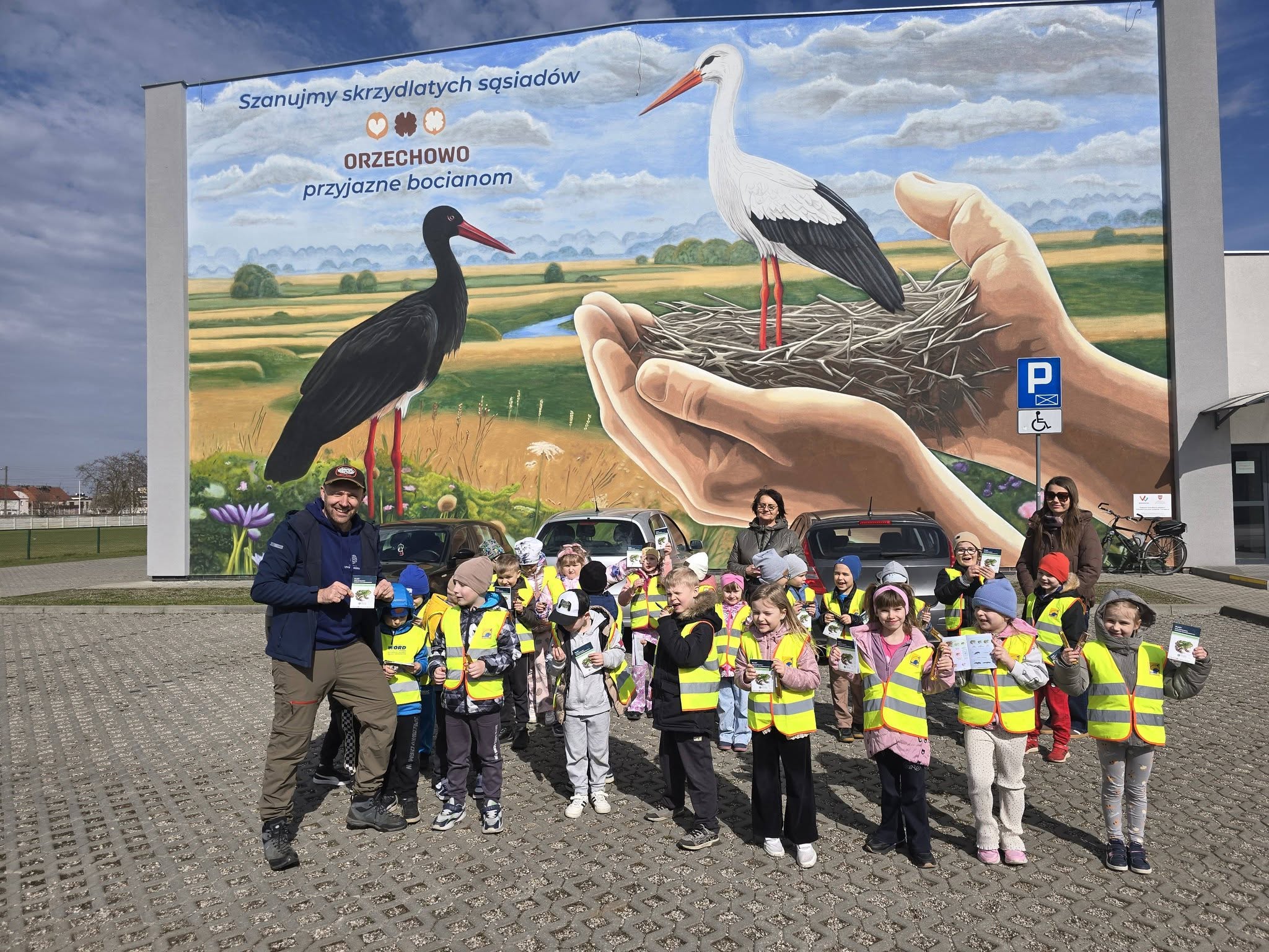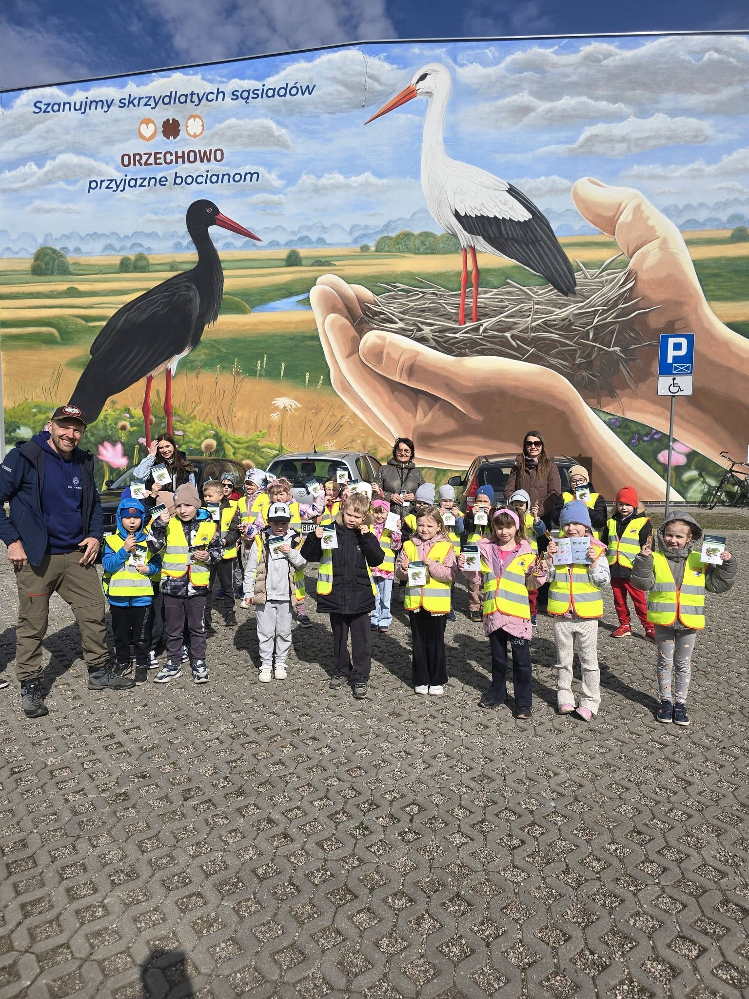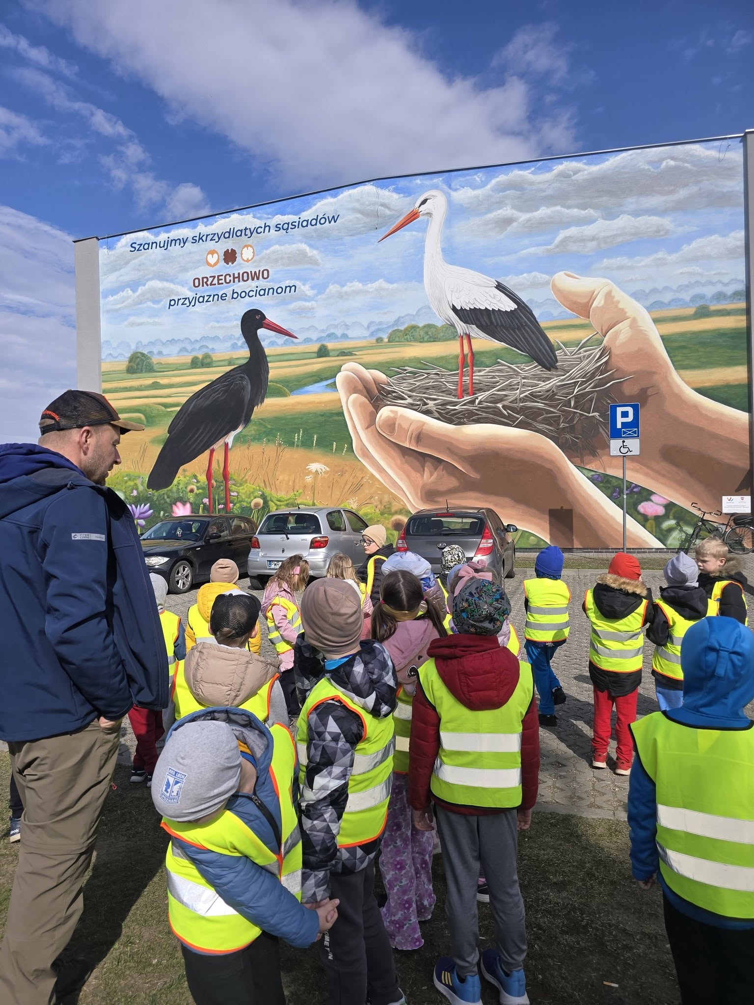 Natomiast dnia 25.03.2026 r. w odbyły się trzecie warsztaty ekologiczne z projektu pt.„Przyrodę kochamy i Bociana Wojtka poznamy” wyruszyliśmy z sześciolatkami na przyrodniczy spacer. Prowadzący spotkanie Aleksander Warczygłowa Sołtys Orzechowa, a zarazem ambasador parków krajobrazowych województwa wielkopolskiego i wielki miłośnik bociana białego opowiedział nam wiele ciekawostek o obrączkowaniu naszych bocianów oraz ich życiu.